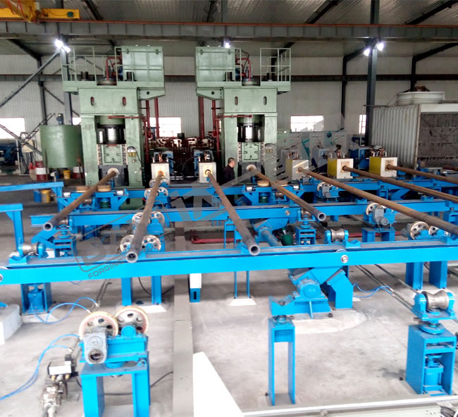 管端加厚機是我公司針對石油鉆桿、油管的加厚工藝研發的新型特種設備,管端加厚的目的主要是為了保證鋼管在管端車加工截面處的強度,鋼管加厚類型有外加厚、內加厚、內外加厚三種工藝。加厚機組有加厚機、輔機及加熱系統等組成,即對鋼管進行橫向運輸、加熱及端部加厚。